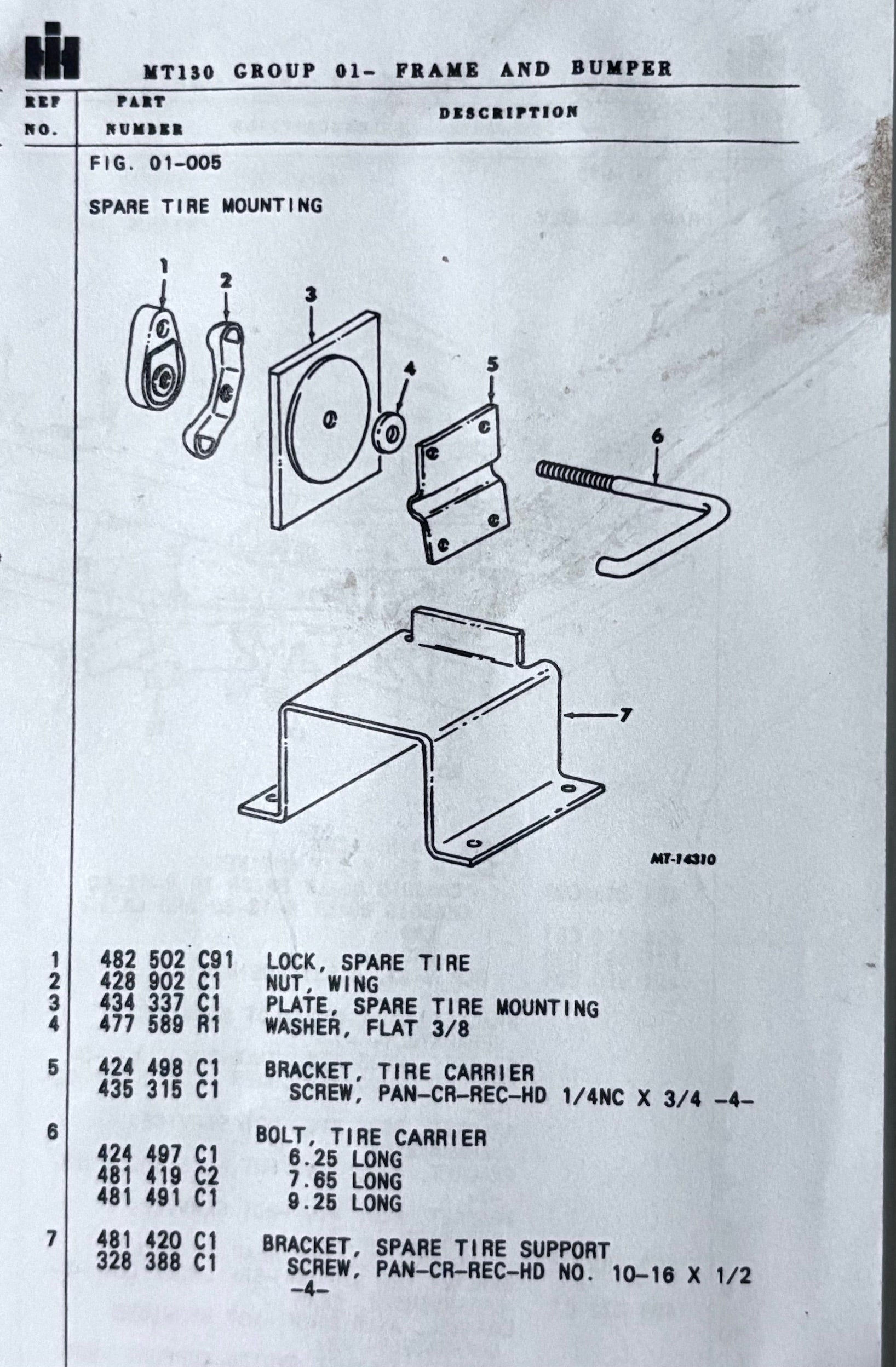 OEM IH STEEL Spare Tire Retainer Plate & Carrier Bolt with Bracket.